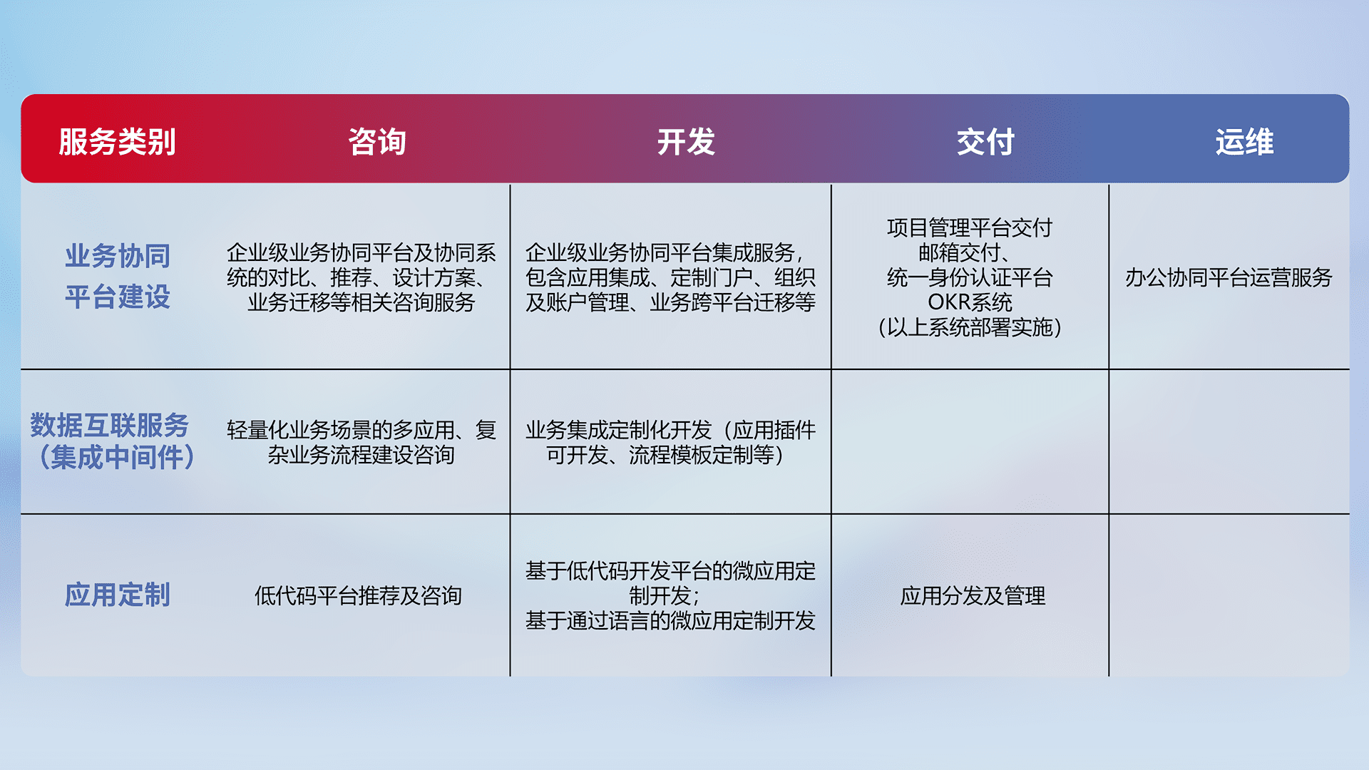 针对钉钉、、、企微、、、IDaas等平台级产品提供产品的规划、、、、方案、、、交付、、、、定制化开发等服务,,实现如统一协同办公、、、智能客户服务、、、混合会议管理、、、、智能数据查询、、等业务场景,,,,实现数字化转型。。。